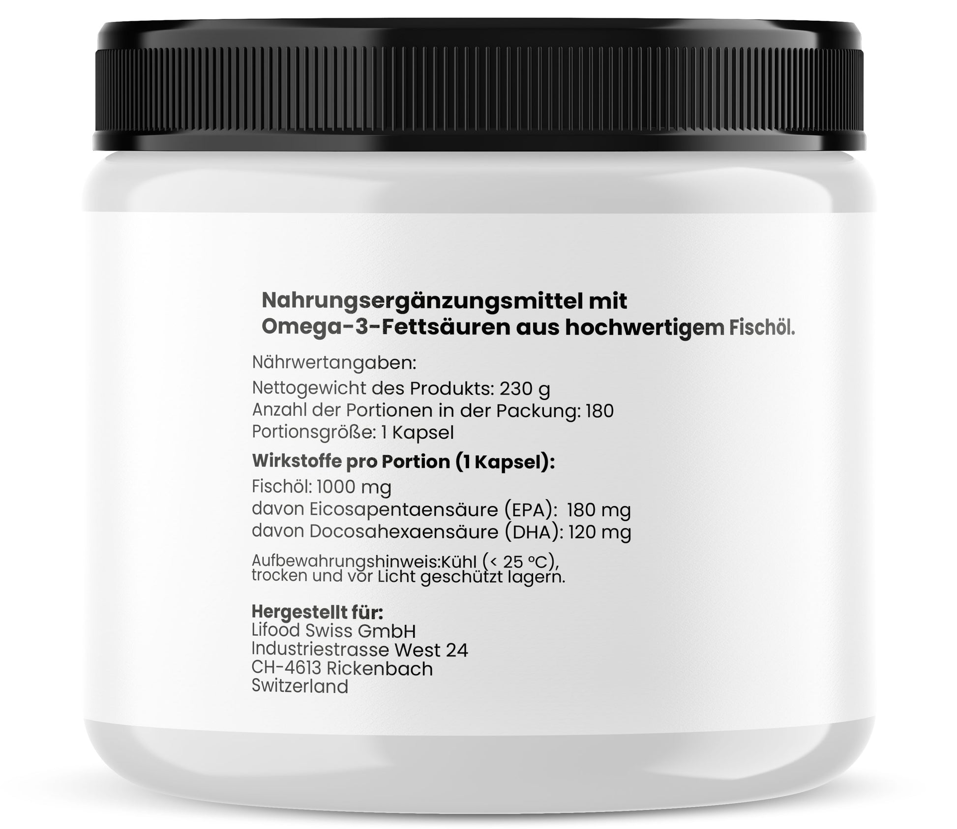 Unterstützen Sie Ihre Ernährung mit unseren hochwertigen Omega-3-Fischölkapseln von Lifood Swiss. Jede Flasche enthält 180 Kapseln, die Sie für ganze 6 Monate mit wertvollen EPA- und DHA-Fettsäuren versorgen. Diese essenziellen Fettsäuren sind für eine ausgewogene Ernährung unerlässlich und bekannt für ihre positiven Eigenschaften.