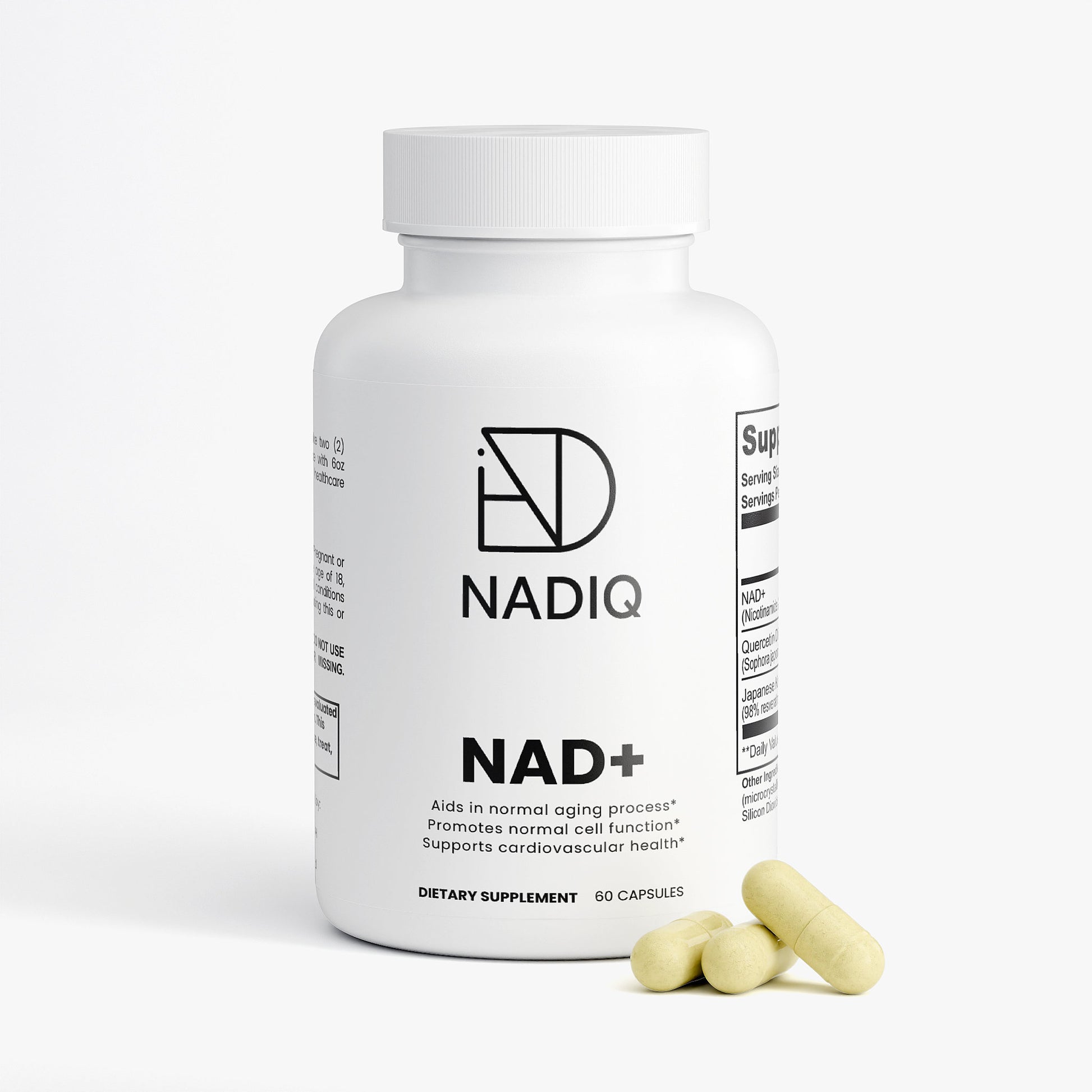 NAD+ (Nicotinamidadenindinukleotid) ist ein körpereigenes Coenzym, das an zahlreichen biologischen Prozessen beteiligt ist – darunter Zellstoffwechsel, Energieproduktion und DNA-Reparatur. NADIQ NAD+ liefert eine starke Tagesdosis von 500 mg NAD+ kombiniert mit Quercetin (250 mg) und Resveratrol (150 mg) – zwei pflanzlichen Polyphenolen, die für ihre antioxidativen Eigenschaften bekannt sind.